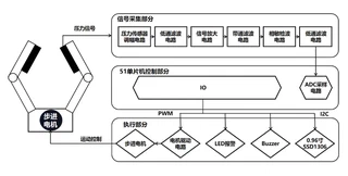 机械手爪部位触觉感应系统功能的实现主要分解为三个部分,第一部分是通过电阻信号输出电路,放大电路,偏置电路,低通滤波电路以及 ADC 采集电路形成整体的信号生成转化电路,将压力信号转化到 STM32 内置 ADC 可以采集的电压信号范围,第二部分为 STM32 采集压。力信号进行处理,通过 IO 口和 SPI 总线向外围电路发送控制信号,第三部分驱动电路接受控制信号控制外围 LED、蜂鸣器、步进电机等驱动设备。该项目整体的设计方案图如下图1-1。